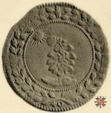 Stemma primitivo dei Gonzaga, ai leoni boemi ed alle fasce, entro cartella coronata, ornata con volute ai lati e cartocci agli angoli superiori. Pianta di girasole (eliotropio) volta a sinistra verso un piccolo sole raggiante, entro corona d'alloro formata da due rami annodati in a. Sotto, il numerale 40.