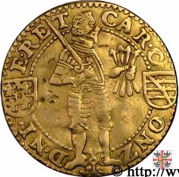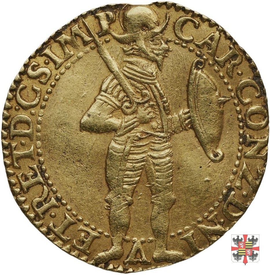1 Sul D/ il duca è stante di fronte e tiene quattro frecce nella mano sinistra, ai suoi lati sono due stemmi; nella cartella sul R/ la scritta è MONETA AVREA C ORDIN V CAROL D G S IMP. Legenda del D/: CAR C ONZ NIVE RETH D.
