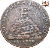 Monte Olimpo sormontato da altare con croce e motto FIDES; in es., OLYMPOS in lettere greche.