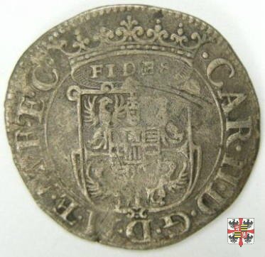 Stemma inquartato alle quattro aquile, entro cartella ornata con volute nella parte inferiore ed ai due angoli superiori, caricato dello scudetto del Monferrato ai nove quarti, quest'ultimo sormontato dallo scudetto coronato di casa d'Austria alla fascia, il tutto sormontato da una corona entro la quale sono un piccolo monte Olimpo e il motto FIDES.
