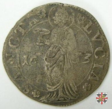 Santa Lucia aureolata volta a sinistra, regge con la mano destra una coppa contenente i suoi occhi, mentre con la sinistra sostiene le proprie vesti. Ai suoi lati, l'anno.