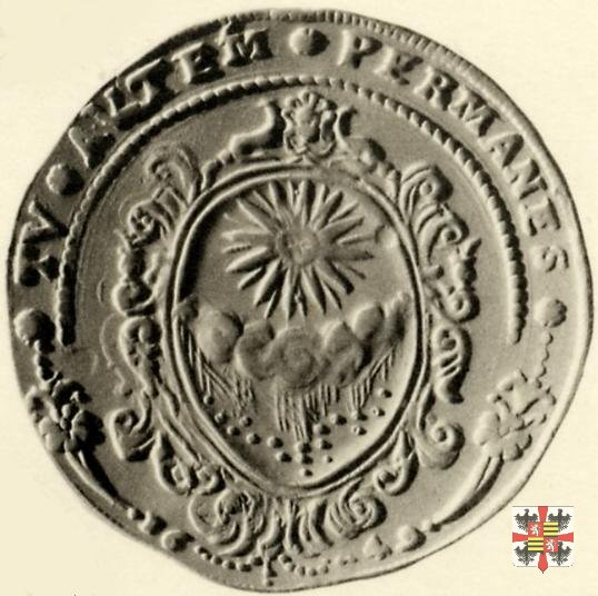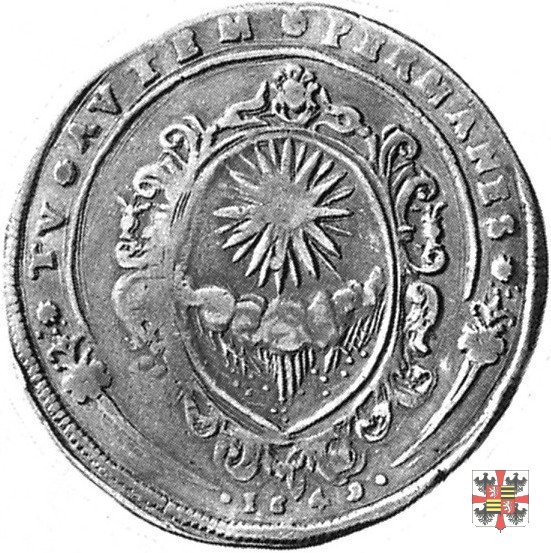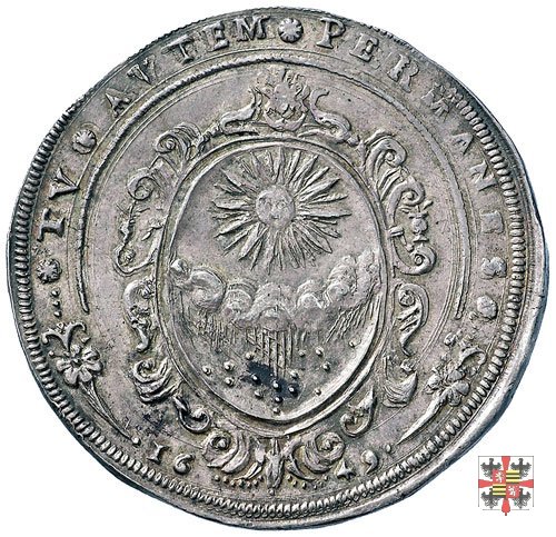 Grande ovale verticale riccamente ornato con cartocci e volute, entro il quale risplende, in a., il sole raggiante di fronte, sotto il quale è un cumulo di nubi dalle quali scende la pioggia. Nel giro in b., data, tra due ornati costituiti da un giglio.