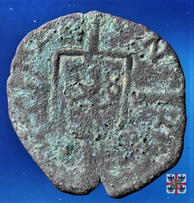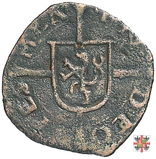 Busto coronato e corazzato a sinistra, con barba corta. Croce patente intersecante, con al centro uno scudo al cui interno è un leone rampante a sinistra