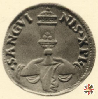 Reliquiario del Preziosissimo Sangue, a cupoletta rotonda a squame sormontata da piccola croce, contenente tre gocce del sangue di Cristo, sorretto da due mani dalle quali scende un drappo.