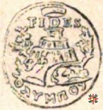 Testa nuda a sinistra, con barba lunga. Monte Olimpo, alla cui sommità giunge una strada a spirale. Sulla cima, un'ara contenente un ramo nodoso, sormontata dal motto FIDES; ai lati del monte, un cespuglio a destra e una quercia a sinistra Sotto il monte, il motto OLYMPOS in lettere greche.