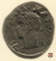 Monte Olimpo, alla cui sommità giunge una strada a spirale. Sulla cima, un'ara contenente un ramo nodoso, sormontata dal motto FIDES; sul lato sinistra del monte, un albero. Testa laureata di Virgilio a sinistra, con nastro svolazzante.