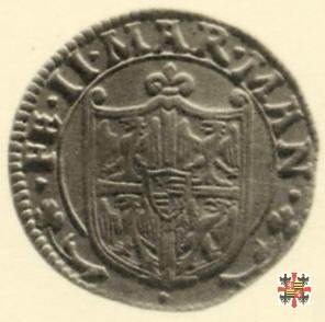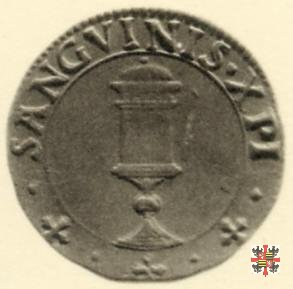 Stemma inquartato alle quattro aquile, entro cartella ornata in alto, caricato da vecchio scudo Gonzaga inquartato ai leoni boemi e alle fasce. Nel giro, in b. a destra e a sinistra, due trifogli con lungo stelo fogliato, con al centro •.