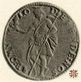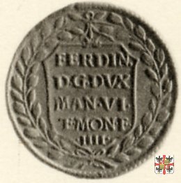 Nel campo: scritta FERDIN •D •G •DVX MAN •VI •ET •MON •F • •IIII • su cinque righe entro cartella smussata e con fregi in a., circondata da due rami di alloro annodati tra loro in a. e in b. San Longino aureolato a sinistra, in uniforme da soldato romano, regge col braccio sinistra una lunga lancia, mentre nella mano destra protesa regge il Reliquiario del Preziosissimo Sangue.