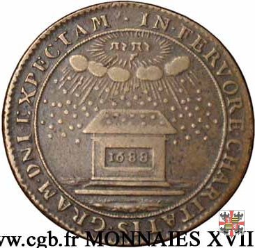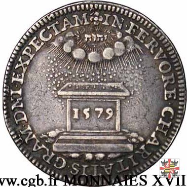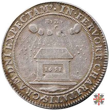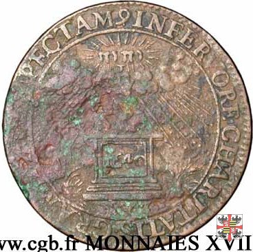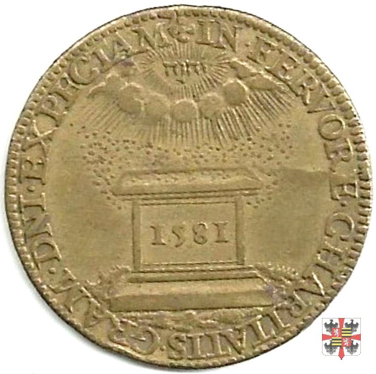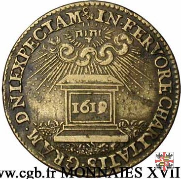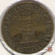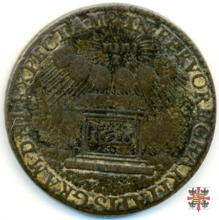 Stemma composito alle armi di Gonzaga-Nevers e di Clèves, sormontato da motto OLYMPOS in lettere greche e da grande corona sopra la quale è una piccola ara. Intorno, collare con fioroni a pendaglio. Un altare sormontato da nubi dalle quali si diffondono raggi e pioggia; sopra le nubi la scritta Jehova in ebraico. Al centro dell'altare, data.