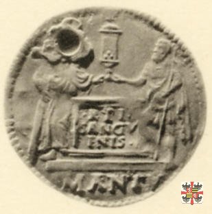 Testa nuda giovanile a sinistra Nel giro in b., data. Sant'Andrea (a sinistra, con una lunga croce) e San Longino (a destra, con lancia ed uniforme da soldato romano) sorreggono il reliquiario del Preziosissimo Sangue, sopra ad un altare sul quale è la scritta, su tre righe, •XPI •SANGV INIS •. In esergo, MANTV.