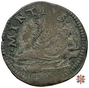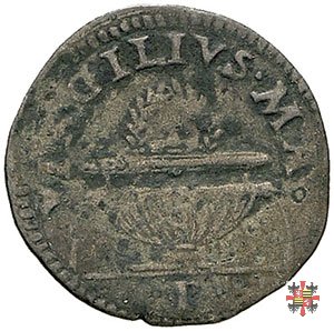 Fontana circolare, dalla quale fuoriescono due zampilli d'acqua, a destra e a sinistra. Sopra la fontana fa capolino la testa di fronte laureata di Virgilio. In b., lettera •P •.