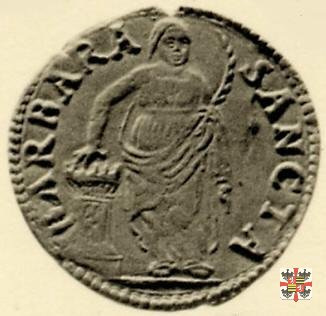 Santa Barbara velata di fronte, appoggia la mano destra su di una piccola torre e tiene con la sinistra la palma del martirio, sorreggendo la veste.