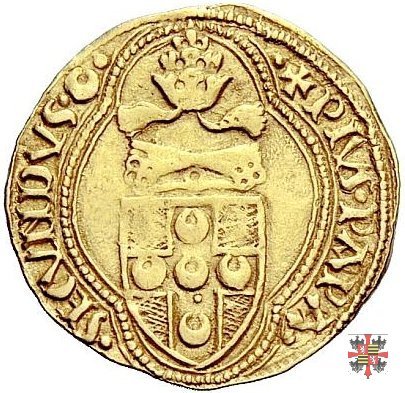 Stemma Piccolomini, sormontato da tiara e chiavi decussate, il tutto entro cornice d'archi.