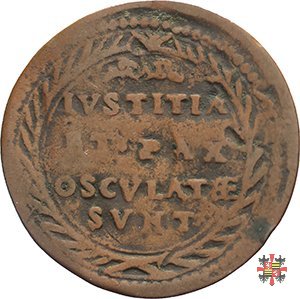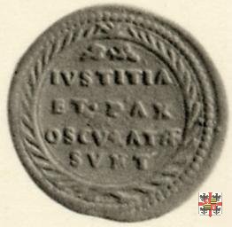 Nel campo: scritta IVSTITIA ET •PAX OSCVLATÆ SVNT, su quattro righe sormontate da un ornato, entro ghirlanda formata da due rami di palma, annodati in a. e in b.1  Una spada e un ramo di olivo decussati.