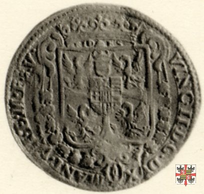 Stemma inquartato alle quattro aquile, entro cartella ornata con volute ai due angoli superiori, caricato dallo scudetto del Monferrato ai nove quarti, quest'ultimo sormontato dallo scudetto coronato di casa d'Austria alla fascia, il tutto sormontato da un piccolo monte Olimpo, da una corona e dal motto FIDES, e circondato dal collare dell'ordine del Redentore.