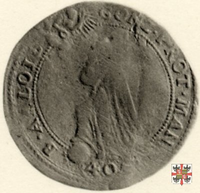 Il beato Luigi Gonzaga a sinistra, aureolato, con l'abito religioso della Compagnia di Gesú, con le braccia conserte calpesta col piede destra il globo terrestre, e guarda verso il cielo ove, in un'aureola di raggi, è un angelo che tiene nella mano sinistra una palma e nella destra una corona. In es., 40 e una corona rovesciata.