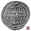 Nel campo: scritta IVSTITIA ET •PAX OSCVLATÆ SVNT, su quattro righe entro ghirlanda formata da due rami di palma, annodati in a. e in b.1  Una spada e un ramo di olivo decussati.