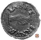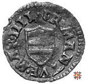 Bagattino col reliquiario e la croce biforcata Dritto: SANGVIN •X •IHESV Reliquiario del Preziosissimo Sangue, a cupoletta a spicchi e sormontato da globetto. Verso: Anepigrafe Croce biforcata, con quattro punti agli angoli e alle estremità. | |