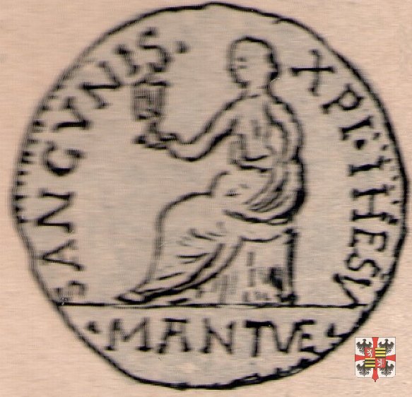 Sant'Andrea e San Longino stanti, il primo sulla sinistra con una lunga croce, il secondo sulla destra in uniforme da soldato romano, sorreggono il reliquiario del Preziosissimo Sangue sopra ad un altare sul quale è la scritta •XPI •SANGVINIS • su tre righe. Sotto l'altare, MANTV.