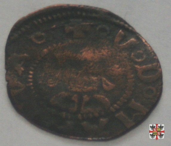 Quattrino con scudo Gonzaga e Virgilio Dritto: ![]() ![]() LO ![]() D ![]() GONZAGA • b •Scudetto Gonzaga alle tre fasce, entro cerchio perlinato. Verso: ![]() ![]() V ![]() D MANtVA ![]() ![]() Semibusto frontale di Virgilio, in dottorale e con berretto a lacci pendenti, entro cerchio perlinato. | |